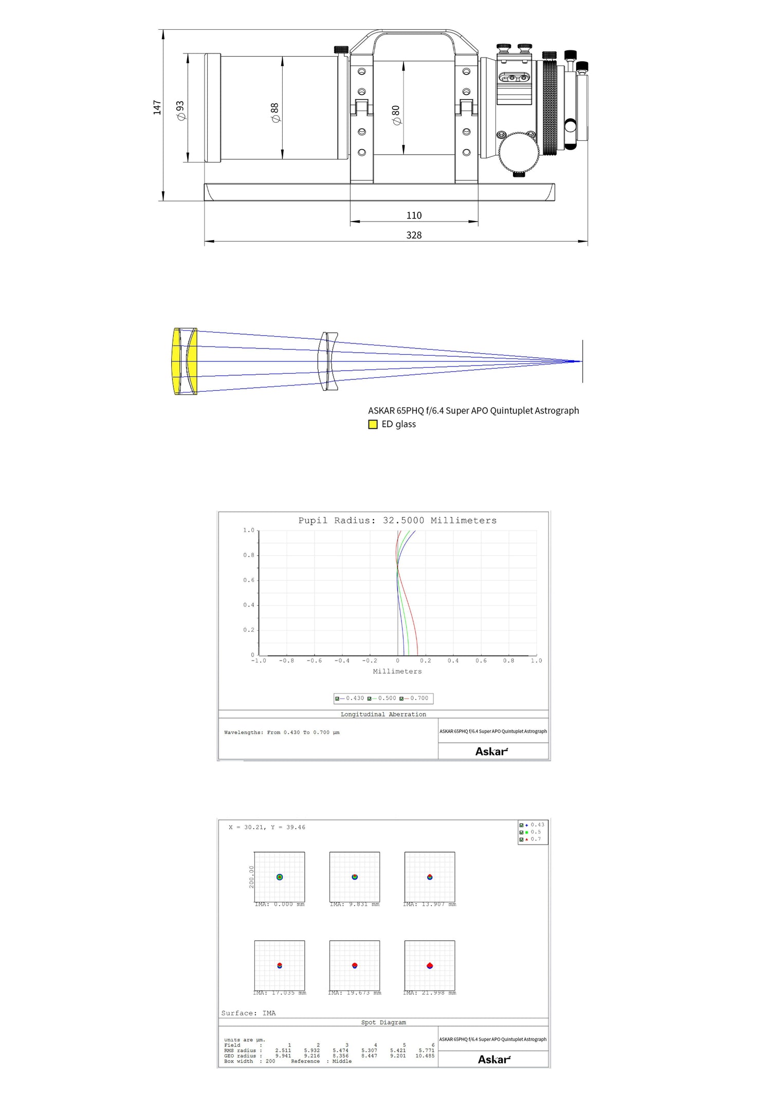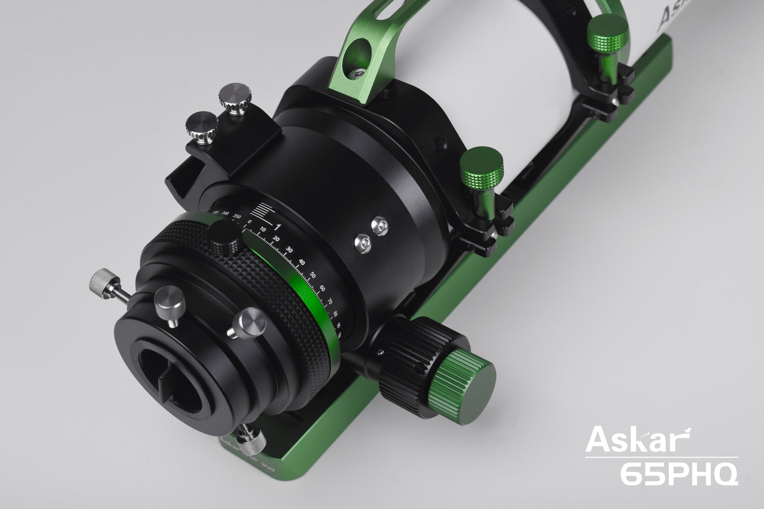 Le Askar 65PHQ est un astrographe compact à champ plat, délivrant une image pleinement corrigée sans flattener externe. Il repose sur un design quintuplet air-espacé avec deux lentilles ED, optimisé pour les capteurs plein format, avec une haute précision optique.
