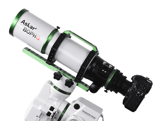 Le Askar 80PHQ est un astrographe doté d’un design quadruplet air-espacé avec deux lentilles ED, offrant un champ plat sans besoin de correcteur externe. Conçu pour les capteurs plein format, il délivre une netteté homogène jusqu’à un cercle image de 44 mm, avec un rapport focal f/7.5.