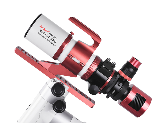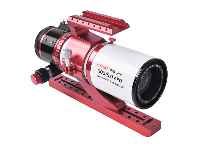 Le Askar FRA 300 Pro est un astrographe réfractif compact et rapide, conçu pour l’astrophotographie grand champ. Il se distingue par une optique Petzval quintuplet entièrement air-spaced avec une lentille ED, assurant un champ plat (flat field) sans besoin de correcteur externe. Cet instrument est conçu pour les capteurs plein format et garantit une netteté remarquable sur l’ensemble du champ corrigé de 44 mm.